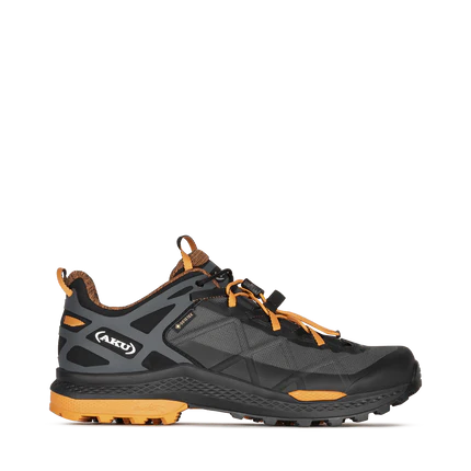 Calzatura destinata all’escursionismo veloce dinamica e affidabile anche sui percorsi più difficili. ROCKET DFS GTX adotta linnovativo battistrada Vibram con tecnologia Traction Lug che migliora del 25% la trazione e la tenuta grazie allo speciale design. La tomaia ha una struttura a nervature incrociate ed è protetta da uno strato 3D print. La tecnologia esclusiva AKU Dual Fit System (DFS), qui realizzata nella versione per lo speed hiking, consente di variare il grado di precisione della calzata agendo con semplicità sui due diversi sistemi di allacciatura. E’ costruita con la tecnologia AKU Elica Natural Stride System per favorire lefficienza biodinamica.